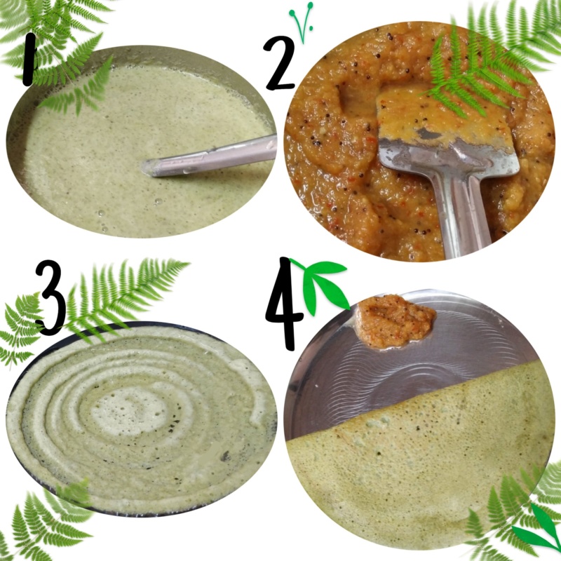 For pesarattu, Mung beans, raw rice, green chillies, cumins, ginger, water and rock salt... For miriyam, onions, red chillies, tamarind, jaggery and salt...
