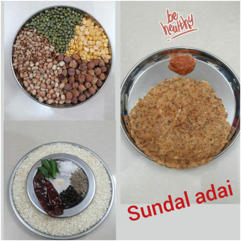 STEP 4> Heat the pan, put sundal adai batter on it, add little ghee or oil, flip it on both sides. Now tasty and healthy sundal adai is ready to eat. Serve it with miriam. Try and enjoy the traditional recipe.